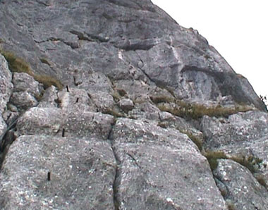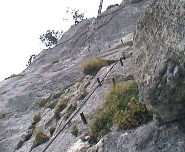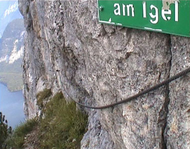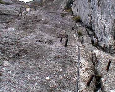 Prvá část cesty je obt. do C s několika místy C-D. Následuje Doppeldach obr. D s několika kroky E v lehce převislé skále. Další část je opět snazší a vyvede nás na zatravněnou rampu, kde přes několik malých stěnek stoupáme snadno dál až k Fledermus Biwak. Následuje výstup obt. C a výše C/D s nějakým krokem E. Im Igel je kolíkový výstup stěnou. Z Putz Bandu překonáváme lehký převísek a stoupáme k nejtěžší části - 100m pilíři. Jeho obtížnost je D/E. Začíná vytlačujícím traverzem a pak ostře vzhůru. Přírodní chyty zde velice jemné. Pilíř končí opět traverzem s jemnými stupy vpravo a pak již snadněji mezi porost. Poslední je rajbasová skalka s hlínou.