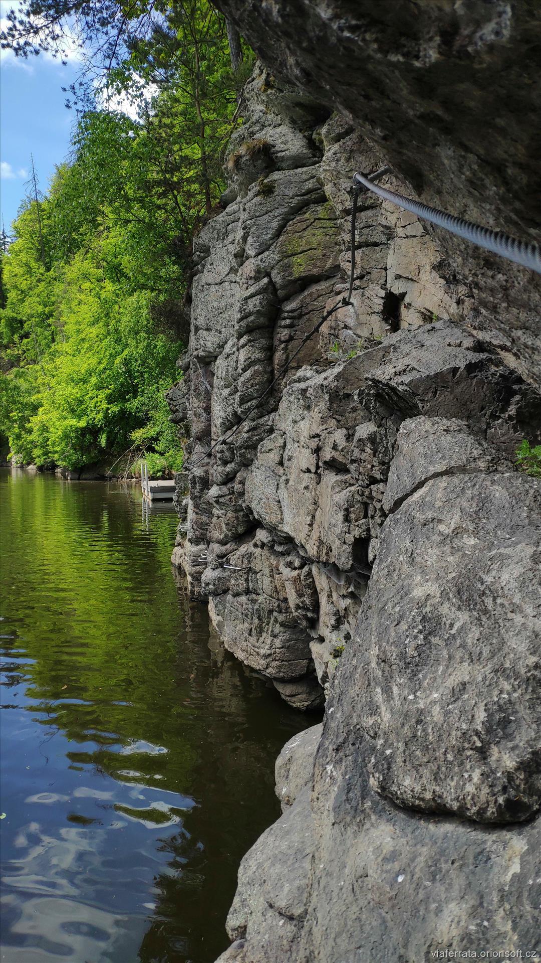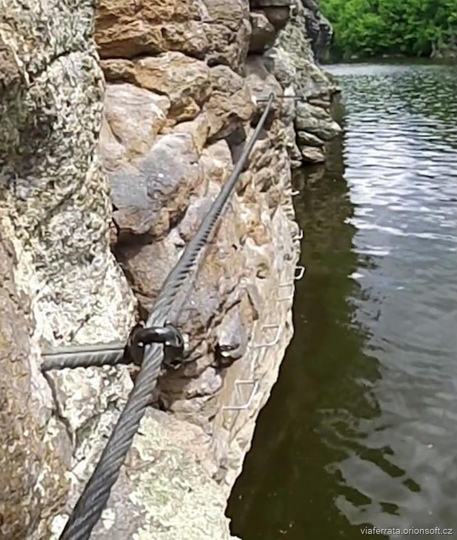 Ferráta – část A - začíná vlevo a pokračujeme dál po proudu.. Celá ferráta traverzuje pobřežní skalky v délce asi 150 m. Většina trasy vede po ocelových kramlích. Některé partie lehce vytlačující.